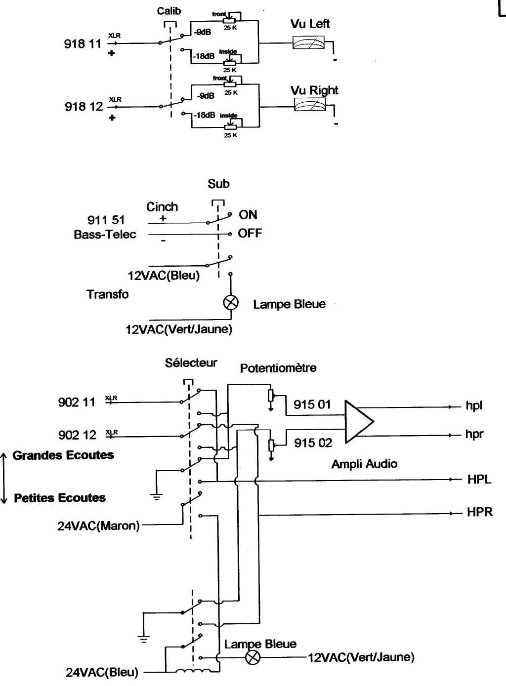 Voici le schéma structurel de l'adaptation pour un studio de mix stéréo avec: switch petite/grande écoute, switch caisson basse on/off, et switch -9/-18 pour le niveau de ref). Merci à Jean-Luc Monnot pour ces infos.