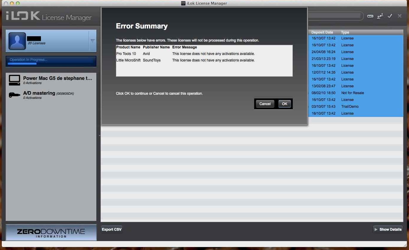 J'ai du arrêter mon travail aujourd'hui parce que mon Pro tools ne fonctionne plus "error, missing Ilok authorization for ProTools 10. Please insert the necessary iLok and restart Pro Tools"... Visiblement ilok license manager a de gros problèmes avec les Ilok 1ère génération. Du coup je suis planté je ne sais pas comment faire pas de sav Ilok ni Pro Tools....