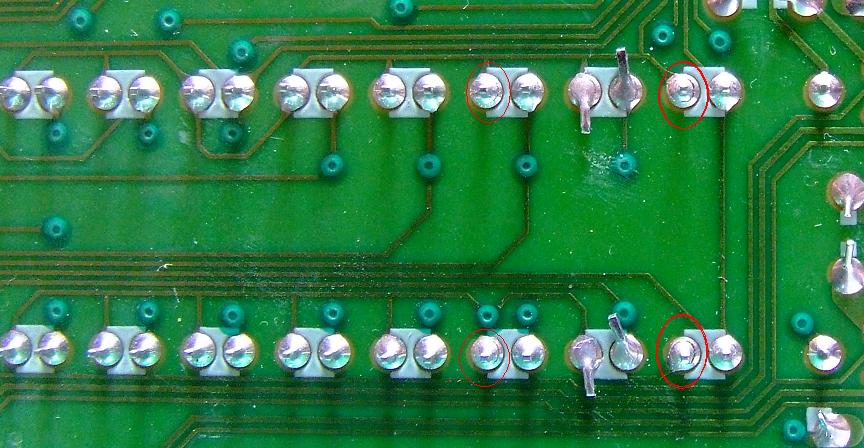 Pour le problème des led, un petit coup d'oeuil rapide sur les soudures .. et le diagnostique est vite trouvé : soudures sèches. Si vous n'en avez jamais vu, c'est l'occasion de regarder la photo, vous saurez par la suite comment les reconnaitre (avec une bonne lumière voire une loupe) et économiserez ainsi des gros frais de maintenance si des faux contacts arrivent sur votre materiel. ça arrive très souvent notement sur du matériel qui a beaucoup tourné longtemps allumé, car c'est souvent due à une certaine chaleur (sur les postes TV cathodiques c'est la quasi majorité des pannes, un peu moins depuis qu'il y a des cms partout, mais c'est le cas partout ou ça chauffe / ou il y a de fortes tensions / intensités).