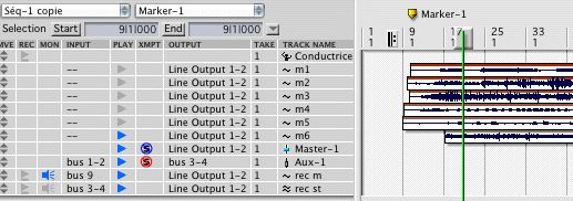 Pour illustrer le propos, je te met un exemple concret, j'ai une piste "m6" sur laquelle je fais un départ aux vers le bus mono 9 (envoyé à "0"). Bus 9 récupéré sur une piste mono "rec m". Je met la piste "rec m" en mode monitoring (le hp bleu), j'insère l'effet voulu sur la piste (ici une reverb), et hop ça marche (si la config est bonne dans l'Audio Setup). Si je veux enregistrer, j'enclenche le rec, et roule.