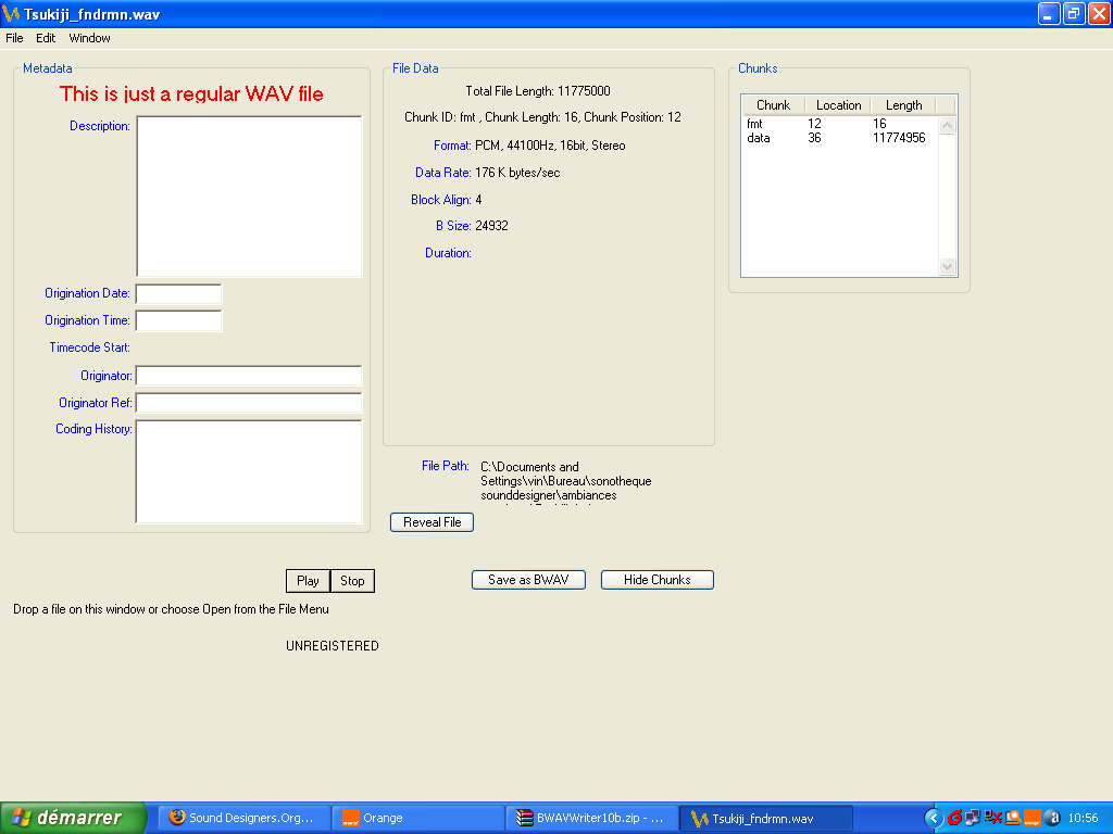 en important avec cette demo certain fichiers wav, il m'indique une erreur dans la case "coding history". There was no coding history in this file. This version of BWAV Writer, doesn't support adding new coding history if one didn't exist. Sorry, I'm working on it je pense comprendre que c'est un fichier protégé. Ce serait une fonction plutôt juste pour conserver et protéger nos propres productions.