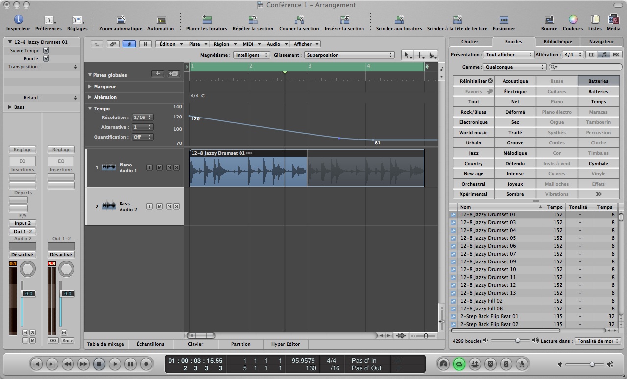 Il y a beaucoup plus simple avec Logic. Effectivement avec un fichier audio standard, les variations de tempo que l'on crée dans la piste globale n'ont pas d'impact. Mais s'il s'agit d'Apple Loops alors ça se met à fonctionner ! Il suffit donc de transformer ton fichier audio en Apple Loops, soit en utilisant l'utilitaire Apple (que l'on trouve dans le dossier "utilitaires"), soit en utilisant la fonction dans la fenêtre d'arrangement : menu audio - ouvrir dans l'utilitaire d'Apple Loop.