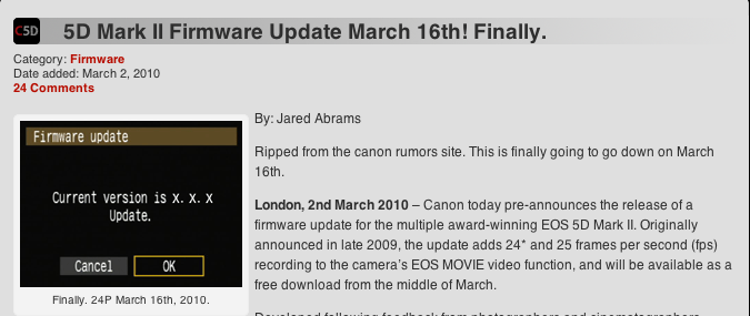Les firmware 25i/s pour le 5d est sortie un peu avant le 7d je crois bien. Dans tout les cas il y a un paquet de type qui adaptent des machines et des firmwares pour ces produits là c'est vraiment bleuffant.