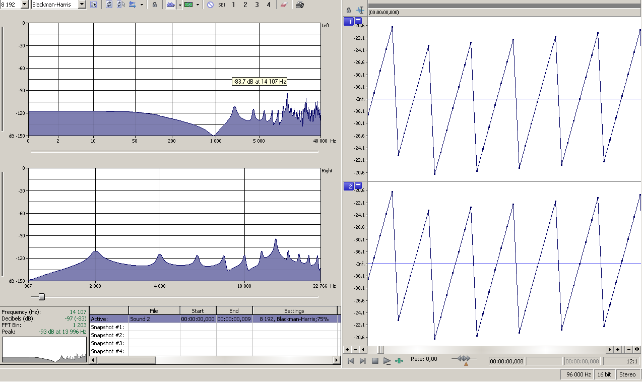 Bien sûr! par mail ou M.P. ... Tu peu également faire un essai assez simple, tu prends ton fichier dent de scie ou carré à 14kHz, et tu met un filtre très raide pour ne garder que ce qu'il se passe en dessous de 10kHz par exemple, histoire de bien virer la fondamentale et les harmoniques supérieurs, et là ... beh, tu mon un peu le gain et tu écoute.