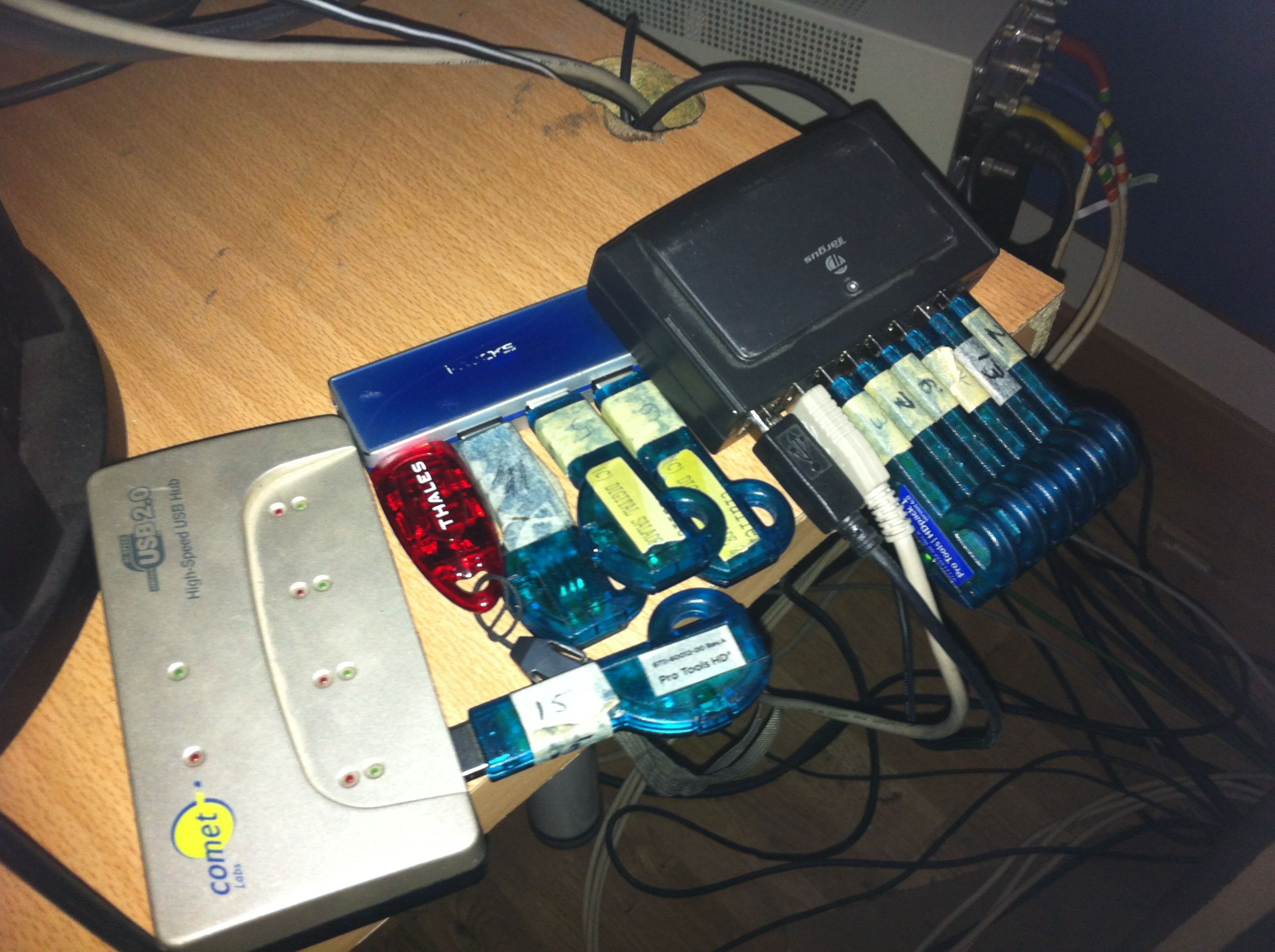Le problème n'est pas tellement pour nous les utilisateurs, mais pour les devs / éditeurs qui ont eux clairement un petit manque à gagner concernant les indépendants (ça se discute, mais je pense que quand même, un peu). Je ne connais pas de grosse structure qui puisse se permettre d'utiliser des cracks (mais je connais mal le monde de la musique). Et je pense pas que cette Plugin Alliance soit heureuse de la situation actuelle, bien au contraire, vu l'investissement temps et financier qu'ils ont du mettre la dedans ! Toi tu n'utilises que Pro Tools / iLok, mais personne n'a ralé quand Pyramix est arrivé avec son dongle Safenet, ou Steinberg avec sa clé Syncrosoft, ou certains avec la clé HASP, etc. etc. selon les éditeurs... Pour le fun je te joins une photo que je viens de prendre avec mon HUB USB 7 ports, pris uniquement par des putains de dongles