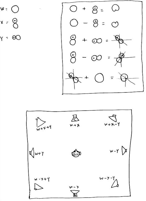 On a une composante omnidirectionnelle qu'on appelle "W", et deux composantes bi-directionnelles. La première s'appelle "X" et est orientée avant(+)/arrière(-), la seconde s'appelle "Y" et est orientée gauche(+)/droite(-).