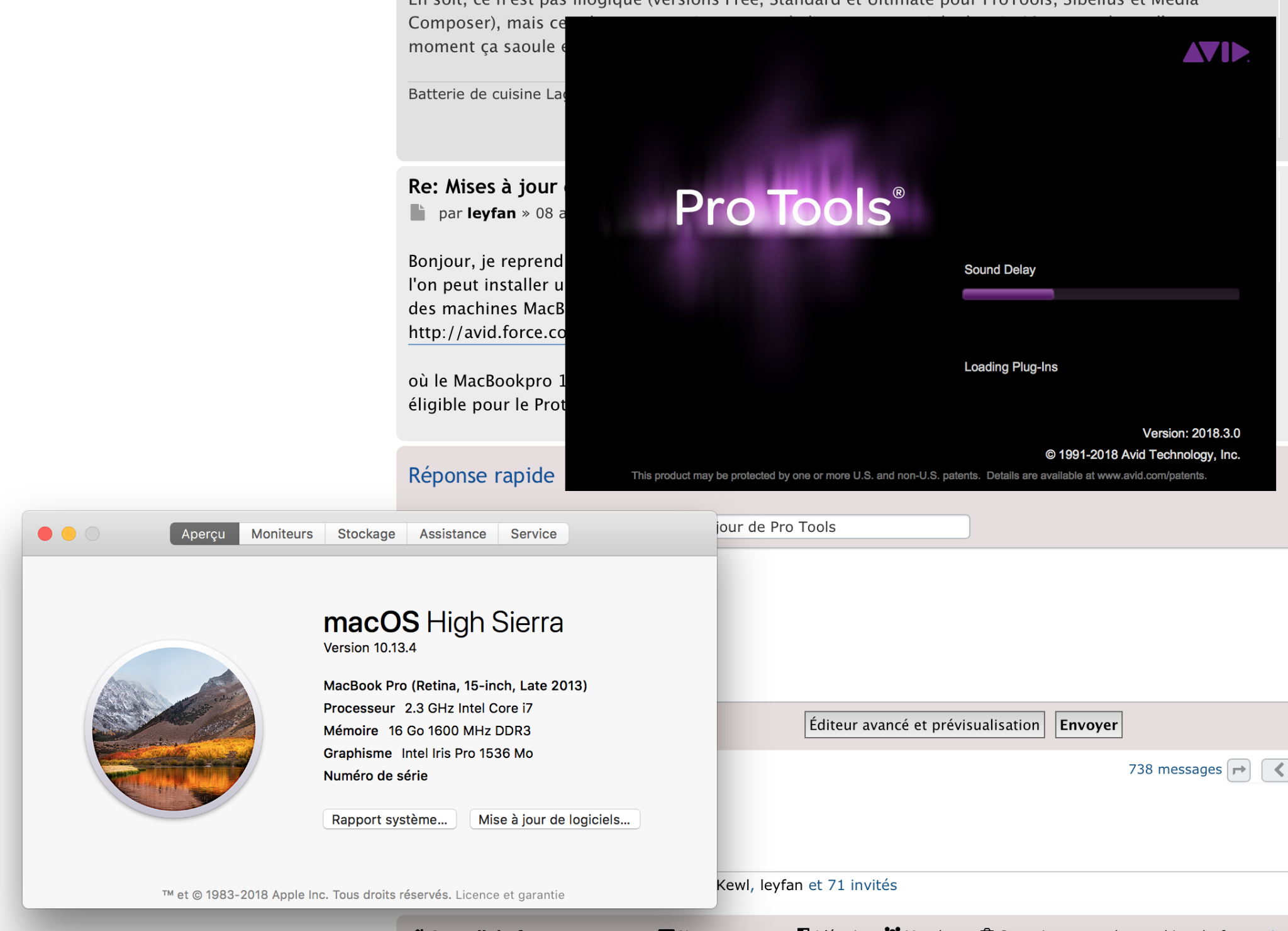 mistinguette a écrit : 22 mars 2018, 14:16MacBook Pro sous Mac OS Sierra, sauriez-vous avec quelle version de Protools ça peut fonctionner correctement?