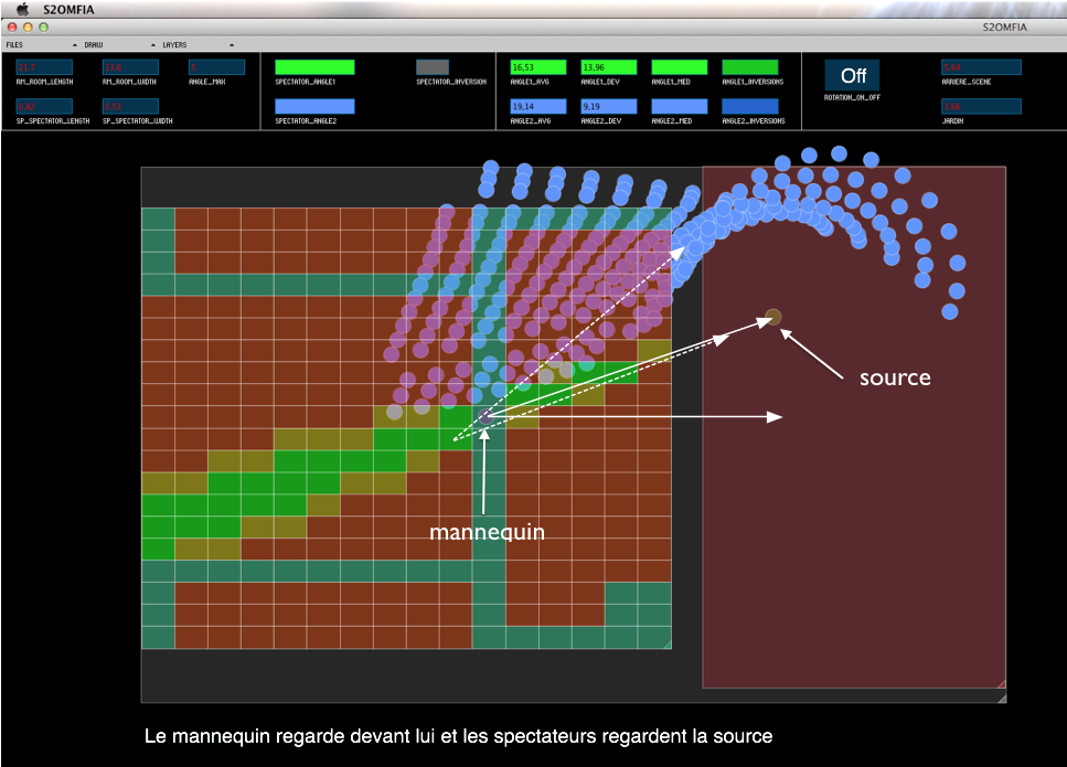 Du coup, Emmanuel Candeias, l'ingénieur de l'équipe, a développé une appli sous Processing pour visualiser les projections sonores et leur décalage d'avec les sources réelles sur le plateau, en fonction de la position du mannequin dans la salle et pour l'ensemble des spectateurs. L'outil va nous permettre de déterminer les conditions optimales d'utilisation du système de captation/diffusion.