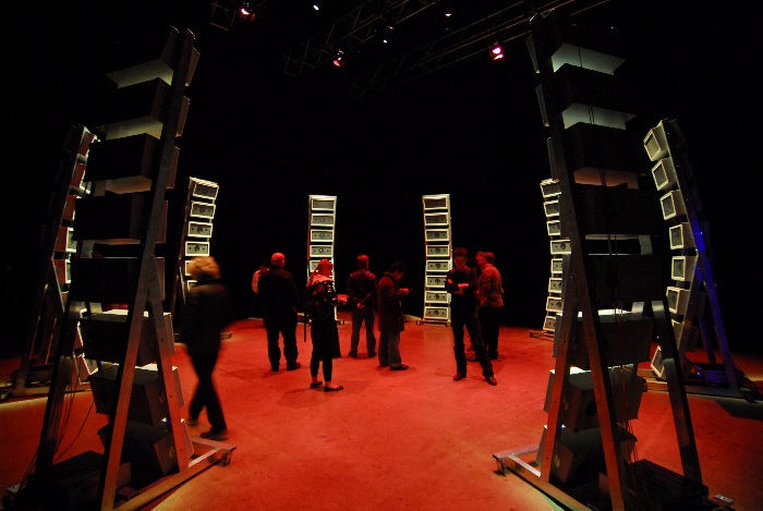 C'est de la musique aléatoire, construite avec SonicBirth et "interprétée" par Plogue Bidule. Tout cela est généré en Ambisonie 3D de 3e ordre (16 canaux) et diffusé sur un système à 64 haut-parleurs.