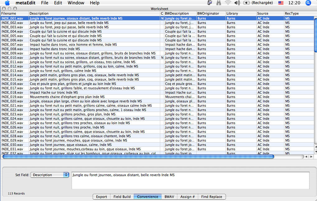 Autant les descriptions sont rentrées à la main, forcement, on écoute le son et on tape un commentaire dans la fenetre correspondante. Mais là ou ça devient sympa, c'est quand on doit rentrer du texte en batch, du style le designer, la librairie etc. On selectionne les fichiers, puis il suffit de rentrer le texte dans la fenetre correspondante. On voit le resultat au fur à mesure qu'on tape.
