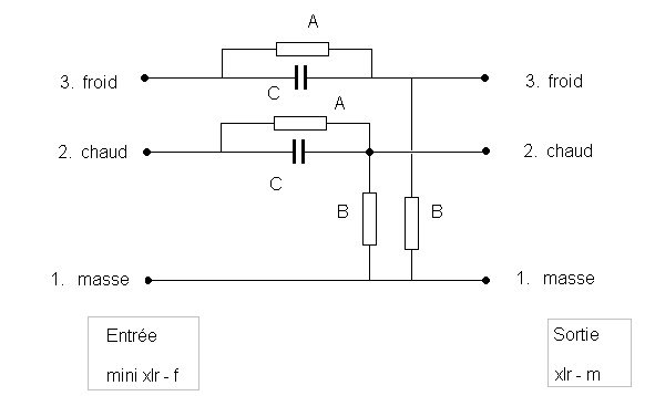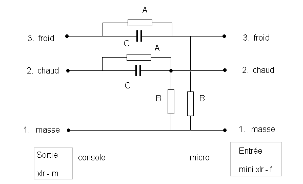 Mm... j'aurais dit qu'elles sont en série de la sortie du preamp micro, puisqu'on sort par point chaud et point froid ... mais pourquoi pas, tu peu expliquer stp ?Dans le cas de ton schéma, les deux résistances B vont se retrouver en parallèle avec la sortie du préampli interne du micro, créant une charge trop importante pour lui. Le résultat sera au mieux une forte atténuation, au pire, la saturation du signal.