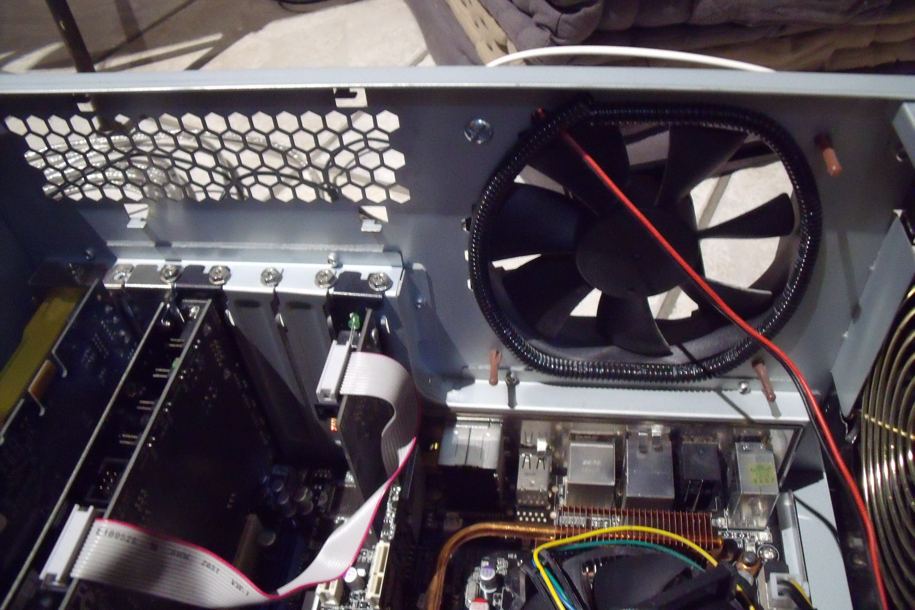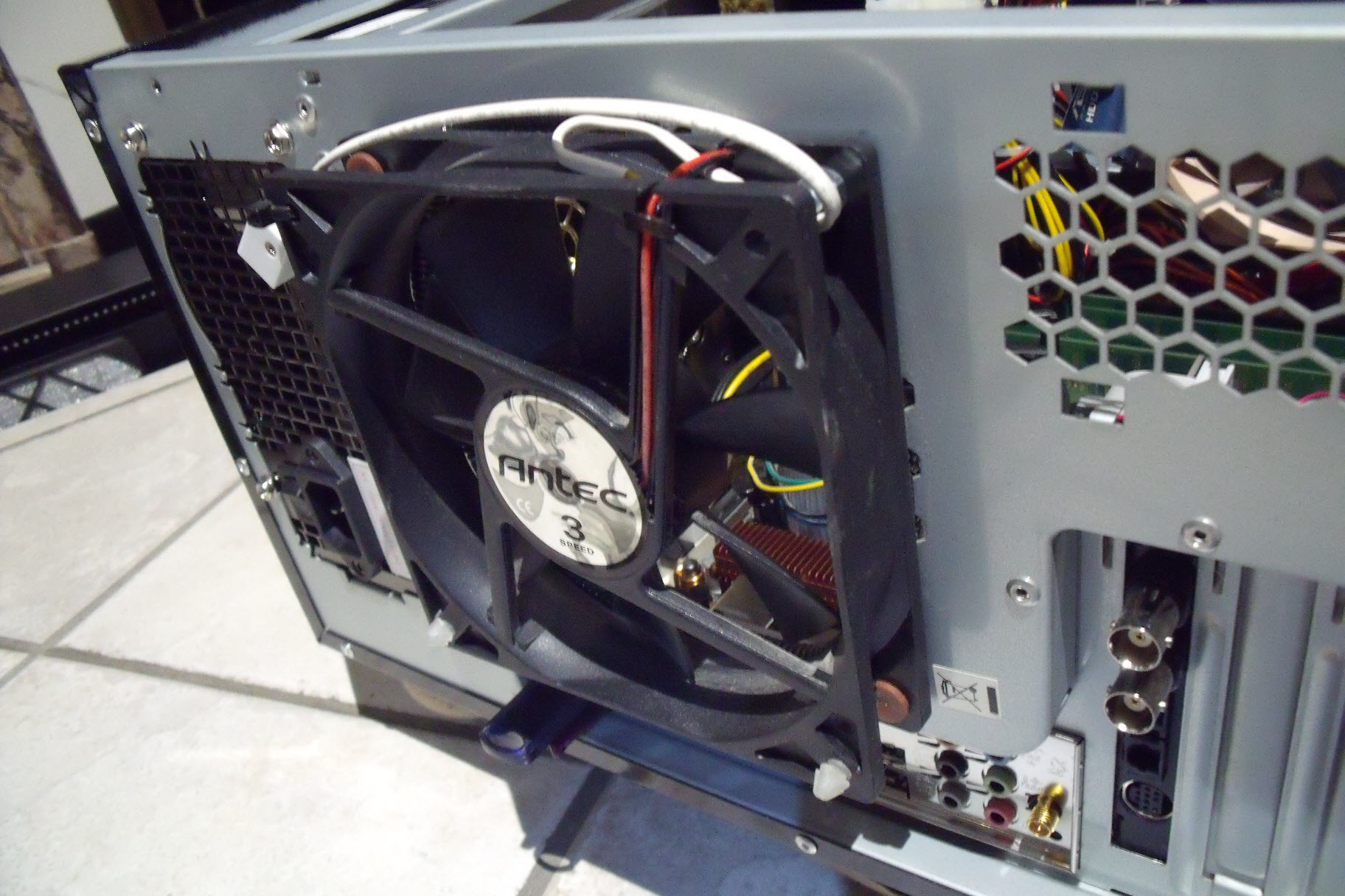 sorti le ventilo arrière d'origine, découpe de la grille d'aération et remontage du ventilo à l'extérieur du coffret pour avoir une charge aéraulique nulle (aucun obstacle à l'éjection d'air) ainsi qu'un tunnel d'aspiration plus linéaire côté intérieur