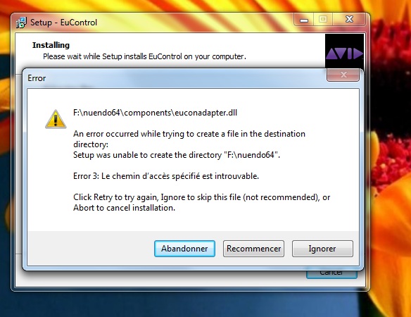 euphonix MC control V1 sous windows 7 /64. je lance l'instal, le chemin de dossier est Ok, un dossier